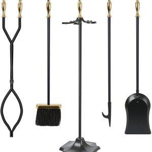 AMAGABELI GARDEN & HOME Fireplace Tools Set 5 Pieces Log Gold Handle Wrought Iron Fire Set with Stand Holder Fireset Fire Pit Indoor Outdoor Tongs Shovel Brush Poker Wood Stove Hearth Accessories Visit the AMAGABELI GARDEN & HOME Store 4.6 4.6 out of 5 stars